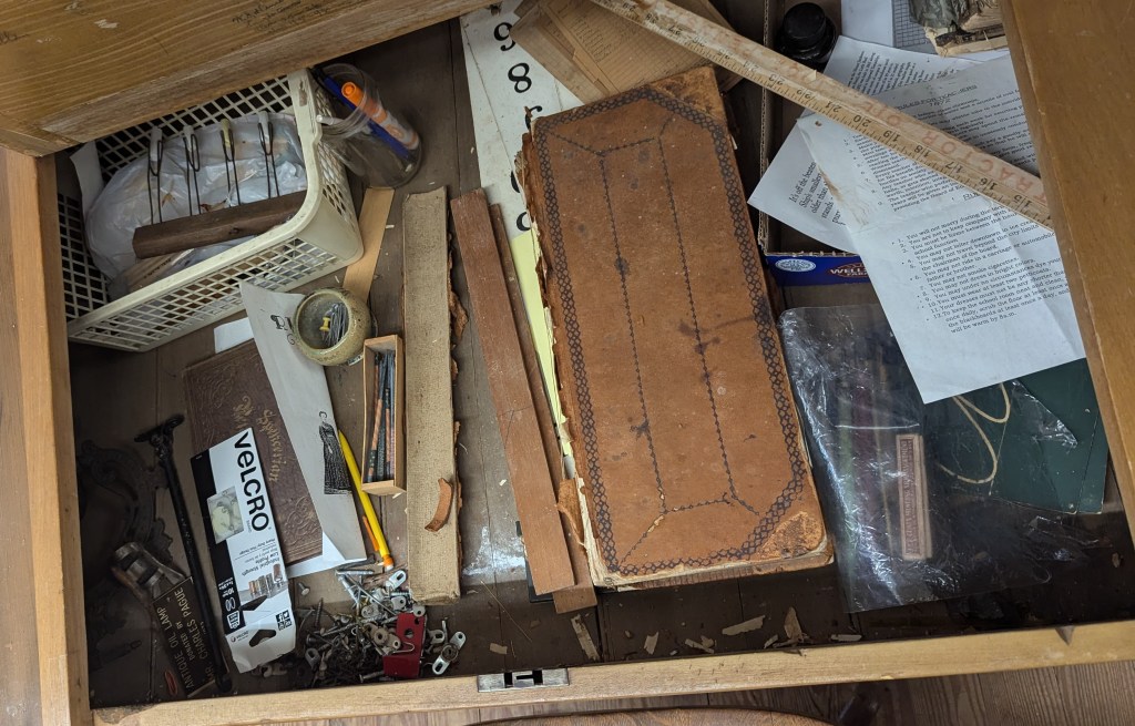 In addition to operating the museum by myself most Saturdays, above you’ll see my main summer project: review Cabinet 47A in the museum’s storage space, ensure that each item was thoroughly cataloged, marked, and photographed–correcting issues as found–and carefully repack it in the archival storage box. The above photograph shows the completed rack, although the differences before and after are not readily visible from the outside.