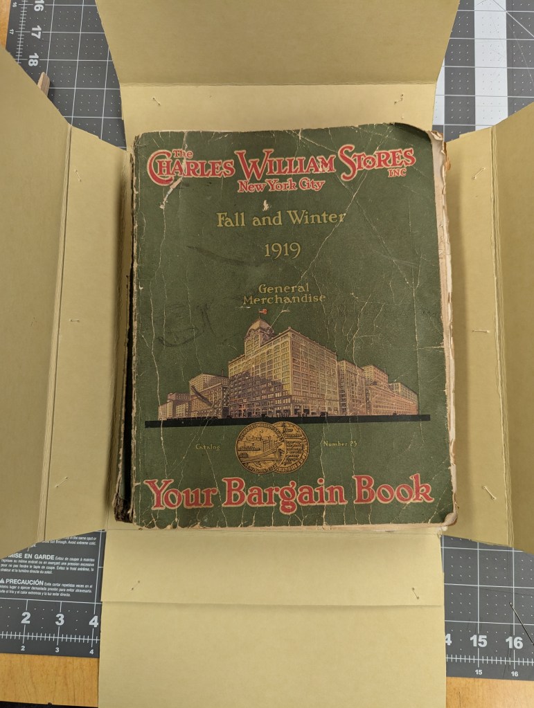 Mail-order catalogues–the “Amazon” of the 19th to late-20th centuries–offer extensive insight to the material culture of their times. Sadly for historians, their publishers constructed them for use for only a season, or perhaps a year, before replacement. Their vulnerability makes them “Prime” candidates for boxing. The 1919 Charles William catalog above suffers from acid-embrittled paper, loose sheets, and a bent spine.