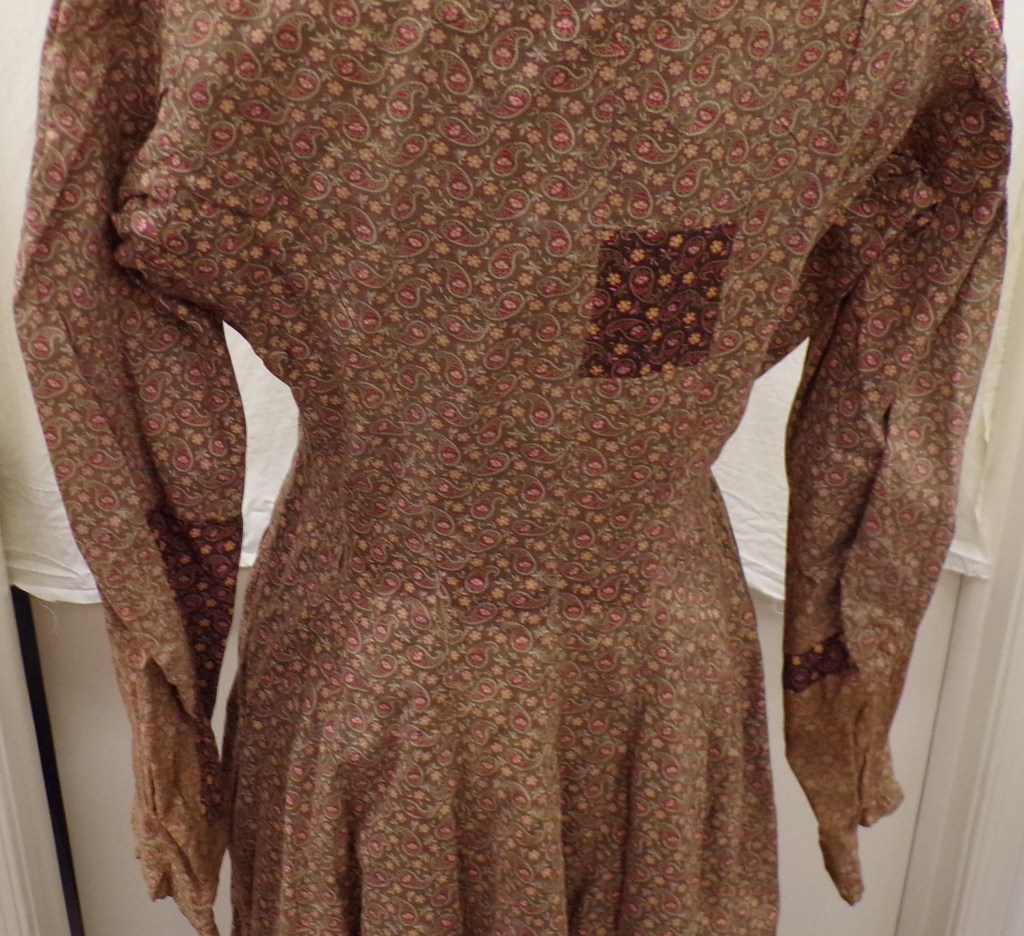 Fortunately, we don’t typically go through the trouble of a full-exhibit mannequin display for internal documentation purposes–a proper display takes hours for a single garment–but I did ensure to capture damage and unique features that help document an object’s condition and assist in interpreting the object’s history. Here we can see repair patches to the back and sleeves that witness the dress’s long life in service. The faded sleeves indicate that in its last iteration it likely served as a house dress, worn for utility while performing chores like washing that particularly affected the sleeves. Occasionally, we’re fortunate to have provenance back to the original owner, which provides another avenue to present insight into the lives of the people who owned, made, altered, and wore the garments.